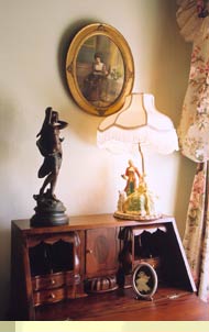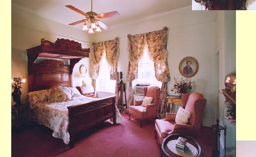 Features a queen size half tester bed in a country floral setting with wingback chairs and a large private full bath. Located on the second floor front porch.